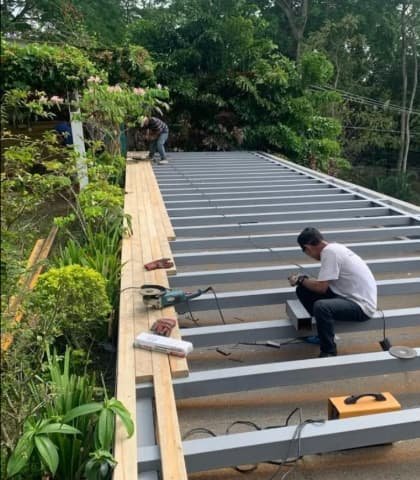 Diseño estructural y armado de deck metálico en zona social, con acabados estéticos y resistentes a la intemperie.