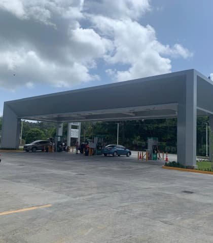 Construcción de estructuras metálicas para estaciones de servicio, con acabados duraderos y montaje eficiente en sitio.